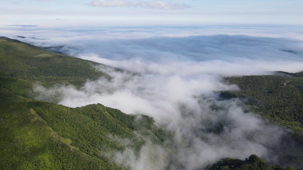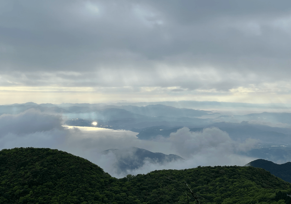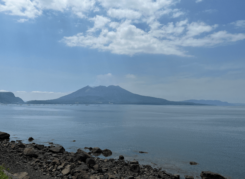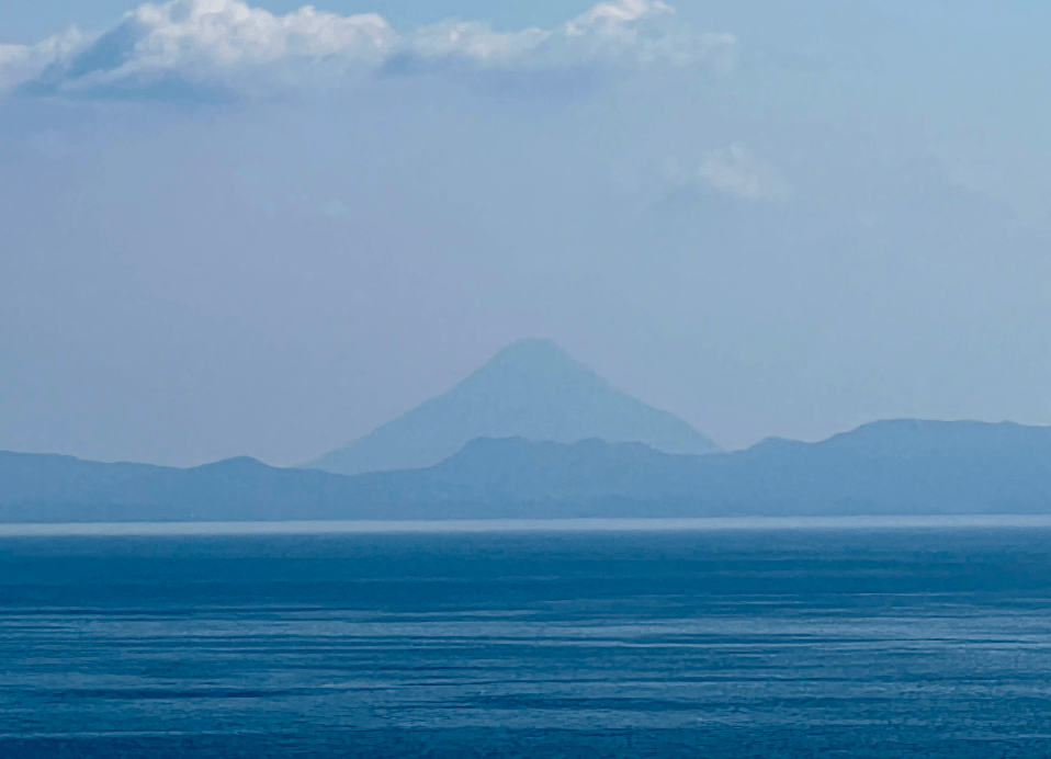 朝起きると青空が広がっていて気持ちがいい、天気予報は雨だけど、なぜか晴れで気持ちが良い、遠回りしてフェリーに向かう事とする。 この辺の山は粘りっこいマグマのせいで急峻な山が多く不思議。一昨年も乗った超高速フェリー乗り場に着く頃には雲が増えて、今にも雨が降りそうだ、雲仙離脱! あれまた桜島戻ったかななんて思うようなデジャブ景色が見える、雲仙も海から見ると桜島みたいだな。
