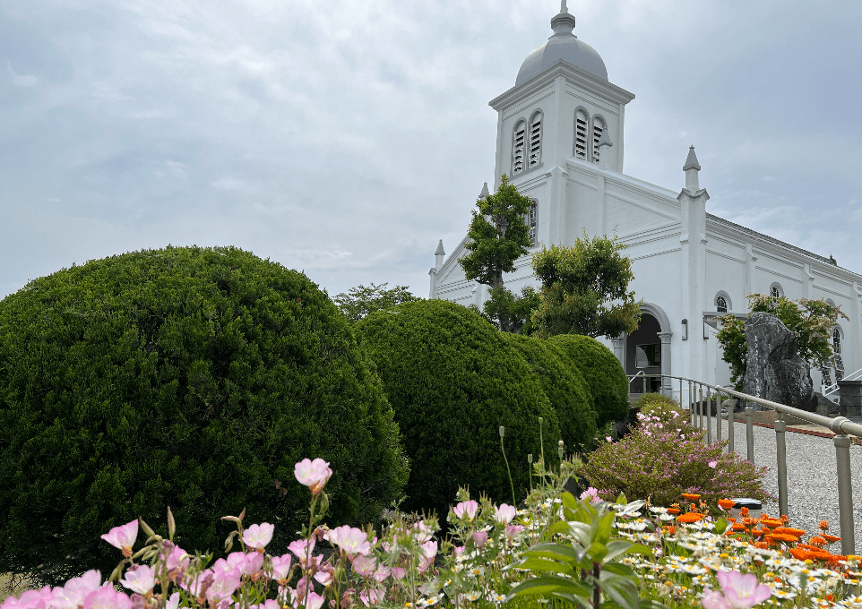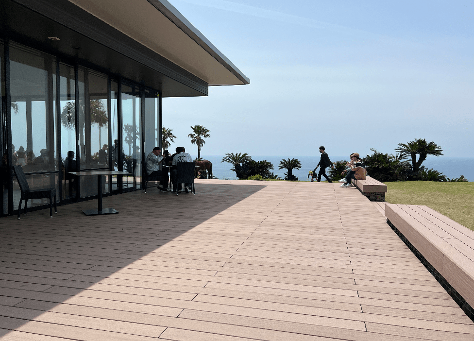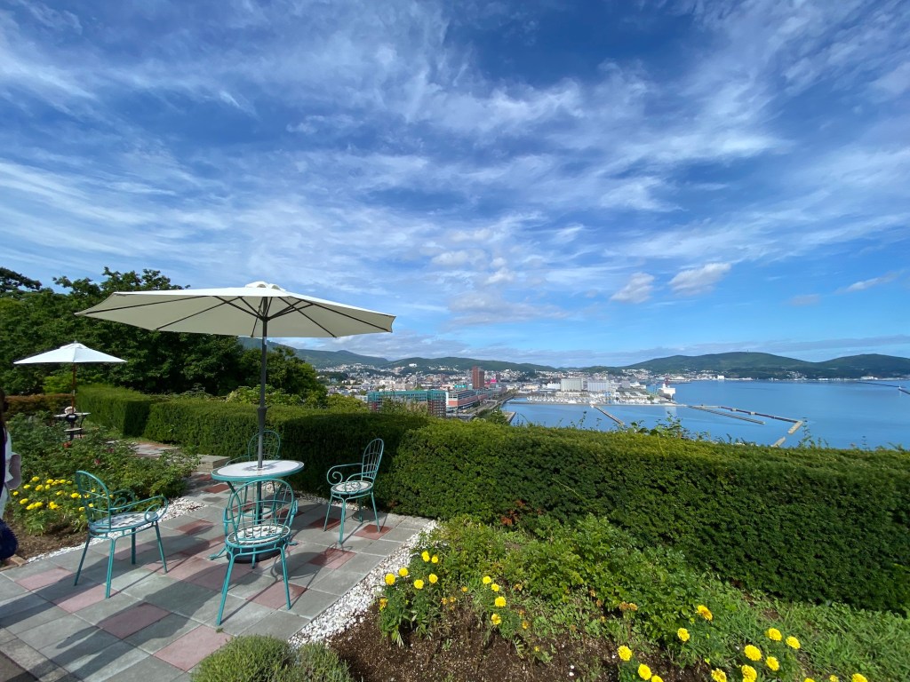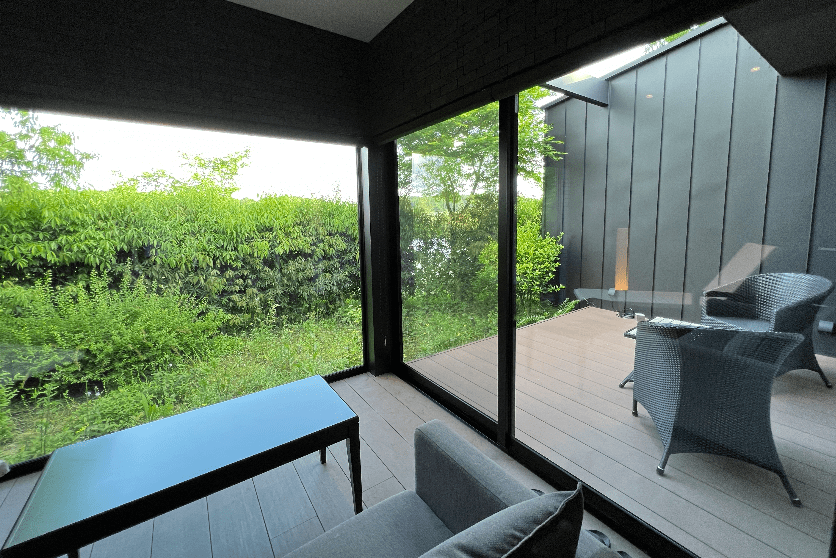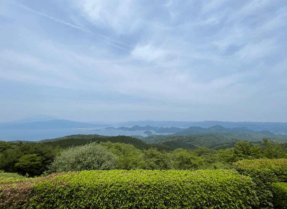 宿に着くと、テラスやサンルームに大理石の温泉が常備される広い室内が気持ちいい、そして食事までの時間に敷地を散歩すれば、先ほどまでいた雲仙普賢岳が遠く見える。