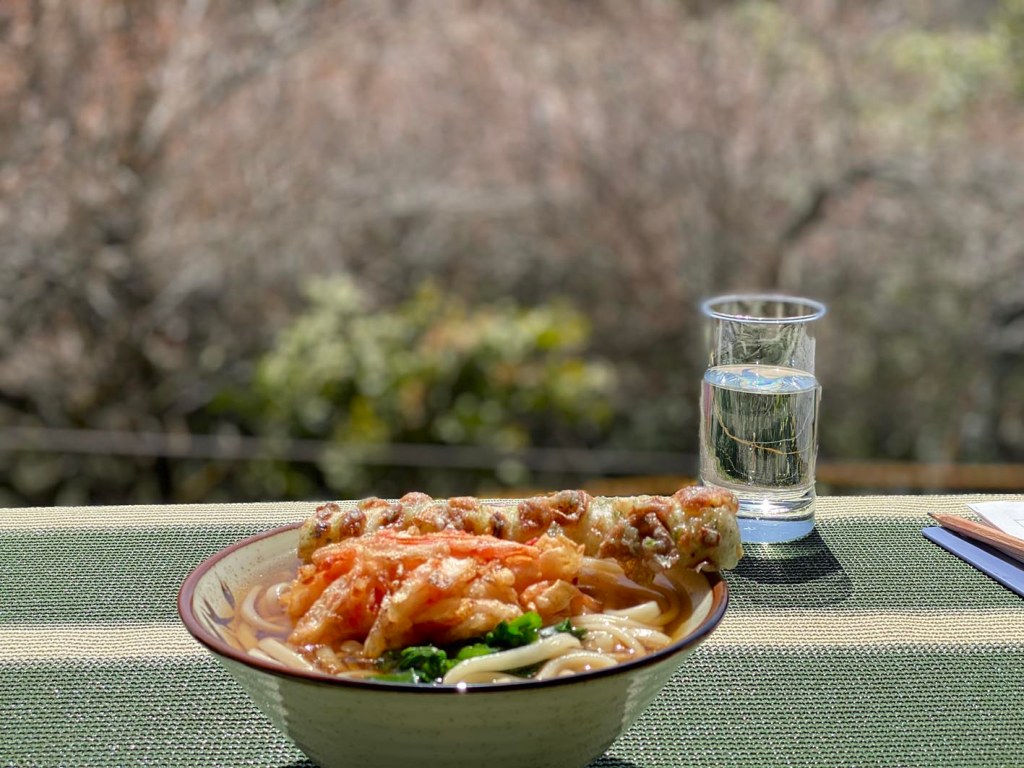 メニューはうどんとコーヒーしかない。うどんの味はさておいてコーヒーはアメリカンで美味しいかった。こいう自然を前にして鶯の鳴き声を聞きながら、コーヒを飲むのもまた良い。店主と色々うどんの話などして、楽しかった。乾麺風うどんを食べに、また来たいとは思わないが、コーヒなら行きたい。なんとコーヒ(200円)が安すぎるのでうどん(450円、かき揚げ100円)を食べざるを得ないという中々の商売だ。できれば大黒屋でお腹を膨らましたい。 ここは『ログハウス犬目』というところで、これが宣伝にはならないかもしれないが記載しておこう。