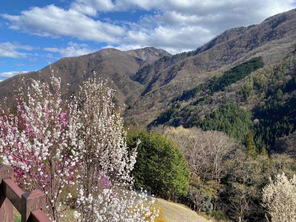 ほどなくして神社に到着、なんだかカラーコンが置いてある、なんと駐車場が閉鎖だ。それでも車は数台いそうなので、広い道に止めて降りて、山道方向に進んでみる。 ミツバツツジが眩く、遠く東京都最高峰雲取山が見える。 山の色は群青色というか 黄色味がかった灰色の独特な色をしている。新芽の色だろうか?幻想的だ。