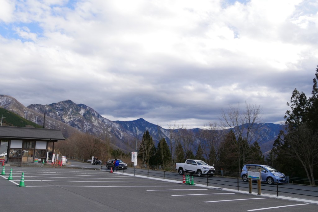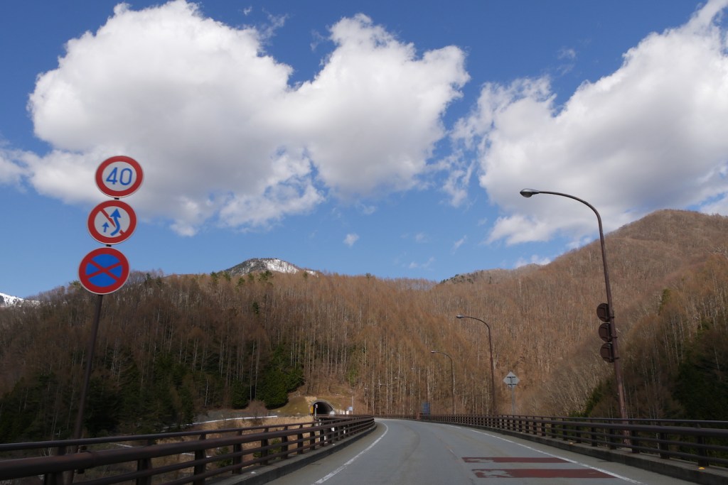 雁坂トンネルまで軽快に走る。途中登坂車線がありとても走り易い。目の前には雪を被った甲武部信が岳が見える。景色は冬の景色になって桜も咲いてなく高度が上がった事がわかる。車もまったく走ってないし、道は広くてスイスみたいだ、そうだプチスイスとしよう。