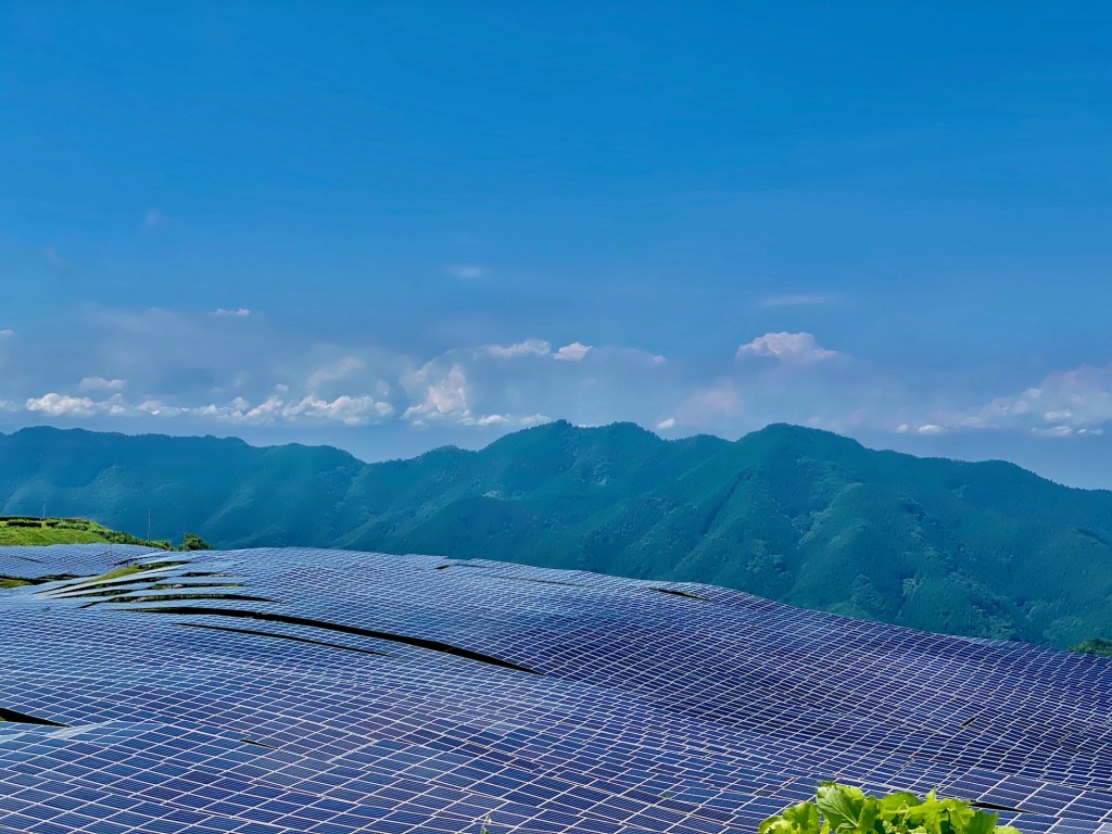 ミートしてバイクを交換、オフ車試乗会始まりと同時に、今回行きたかった所に行く、もう絶景すごすぎ、こんな景色は日本でここだけだと思う、遠くみると、山の湖の様だが全て太陽光パネル、その異様な感じを出してるのが、仰角レスで、山頂に設置という稀な設置方法、風の抵抗を考えてこうしたの解らないが、実に奇妙な風景が広がっていた、もうこれを観れただけで大満足だ。そしてこの静寂の山の中に唸るインバータの騒音、気持ち悪い。そもすると遠くから我々の所に車がやって来た。そういえば手前に全面通行止めってなってたっけ、観ては行けないものを見てしまったか、ここは政府の秘密基地でこれを見たものは記憶を消されるか、拉致されるかもしれないと思う様な雰囲気最高。いやいやそんなことは無かったけど、想像を掻き立てる様な場所だった。車は通り過ぎて行ってしまったけど、不気味な所だ。