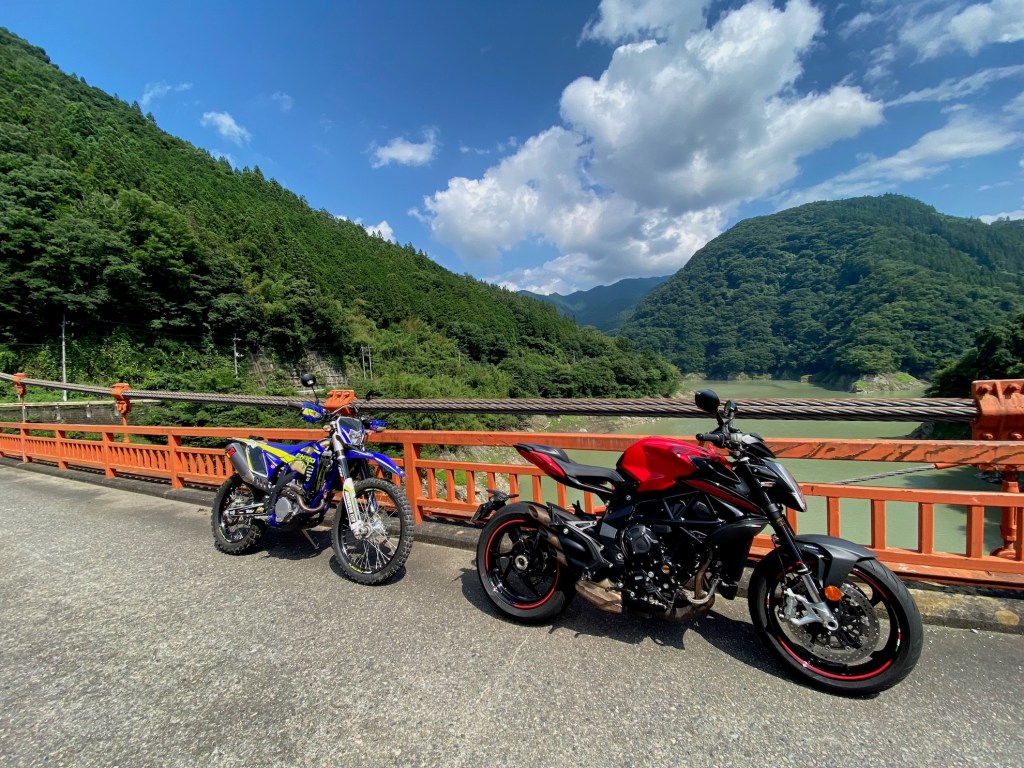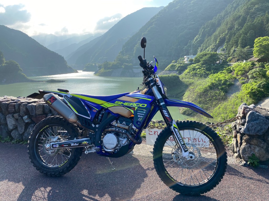 高速降りて、少しすると絶好のワインディングが待っている、軽い車体と電装系をFETに変えてサスもバネからワンオフでチューニングした事で、軽快にコーナを舐める様に曲がる、全くもって不安がない、ロード向けにバネから変えたサスもいい感じで、トラクションがしっかり入る。ワインディングが楽しいオフ車なんてこりゃ贅沢だ。