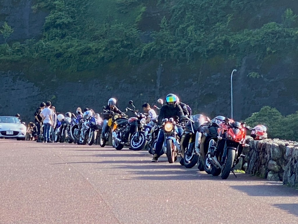 目的のまちわせ場所に到着、結構名所なんだけど、誰もいない 気持ち悪いかも、人々は一体どこに行ってしまったんだ、数あるお店も閉まったままだ。そんな所に一人ポツネンと座ってると、遠くバイクの音が近ずいてくる、誰もいないし静かだから、かなり遠くから聞こえてくるから面白い、数分して到着。 いやいや、ノーマルでもあの音なんだから、静かな所だと結構音が届くと再認識、やっぱり集落は静かに走らないとだな。