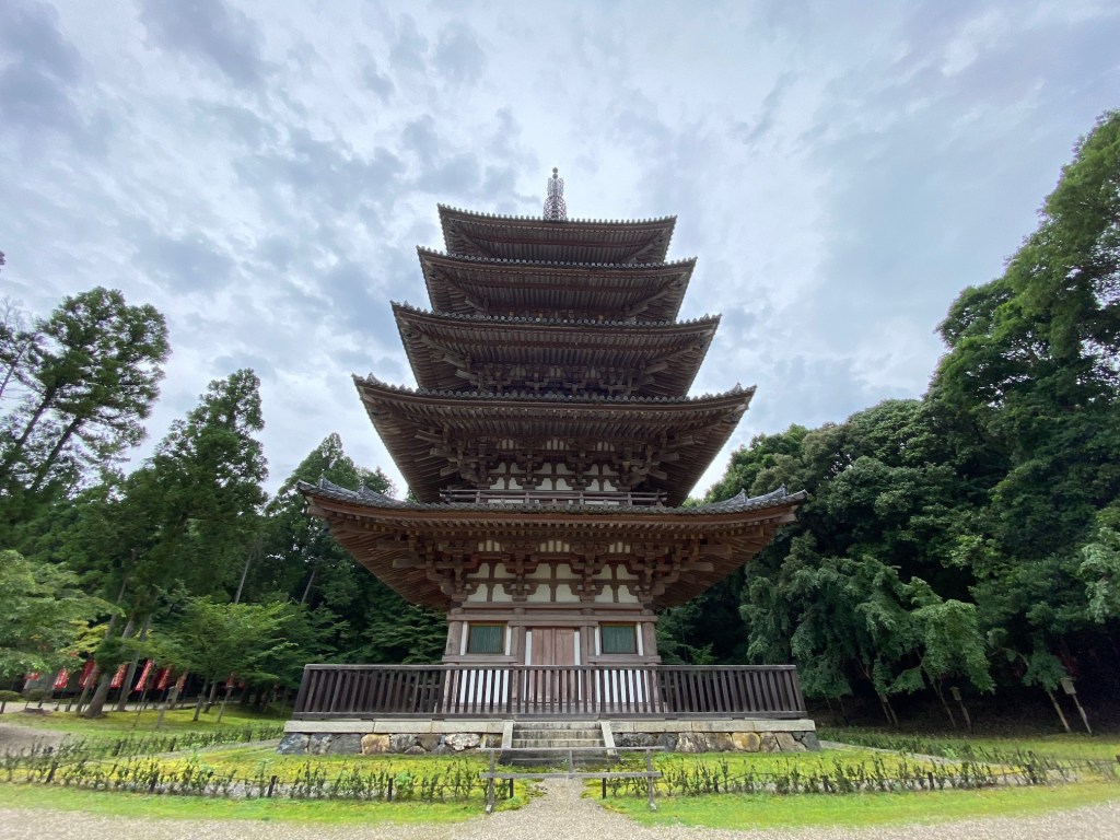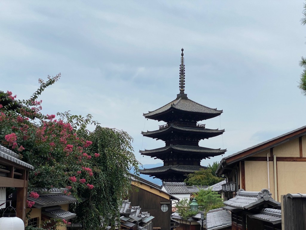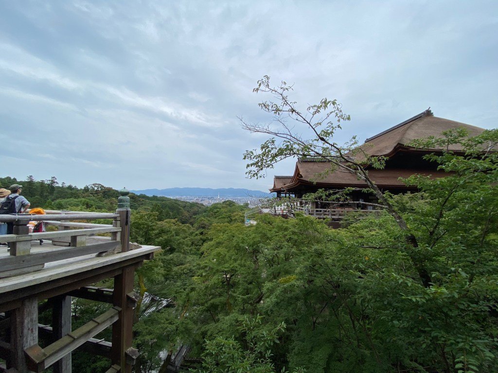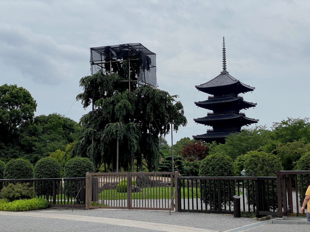 人が少なく、外人もいなく、30年前位にタイムスリップした貴重な清水寺を堪能して、帰りに前から気になっていたカフェを探すことに、其処はtvで見たことがあって京都を一望できるカフェなんだけど、その一望って所だけしか覚えていなく、当然場所も分からないし、名前も当然覚えてない、唯一景色がいいと言う事だけだ。参道を下りながら直感的に細い小道を行くと、見た覚えのある景色が広がった、ここだ。我ながら流石だと思う、ここで抹茶あんみつを食べて、清水寺コンプリート。いやもう雨も降らないし暑くもないし素晴らしすぎた。宿に向かう途中、昨日寄った八坂の塔(法観寺)に向かう、幸運にも内部の見物が出来てラッキー五重塔の中に入れるなんて、すごじゃないか。中は混沌とした作りで基本構造が困難で謎が深まった。時間もあるので、こうなったら京都五重塔コンプリートって思い、東寺に向かう。やっぱり空いてるからアッという間だし、駐車もごく近傍に停められるから効率がいい。