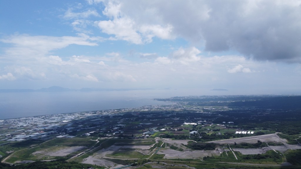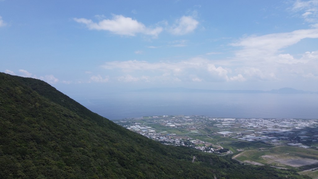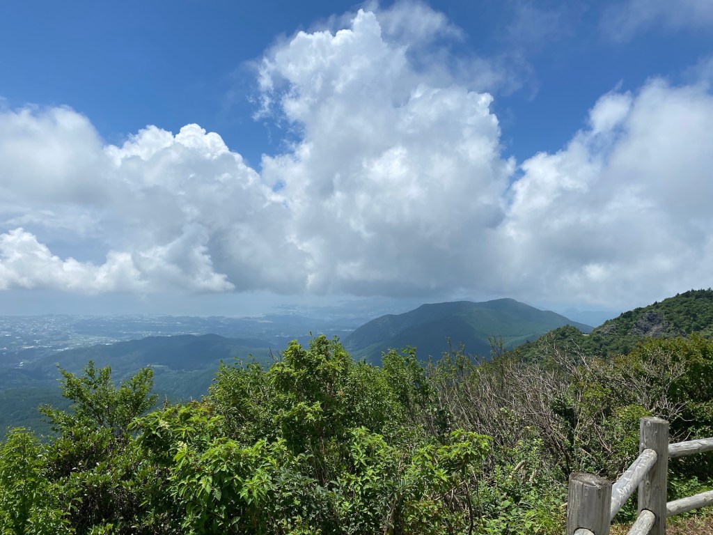 絶景展望台に到着、バイクツーリングのグループいたけど、あとは誰もいない絶景展望台。雲が同じレベルに見えて幻想的だ。そしてあの山が最近出来たなんて凄いな。でも一部は森になっていて自然の力は凄い。