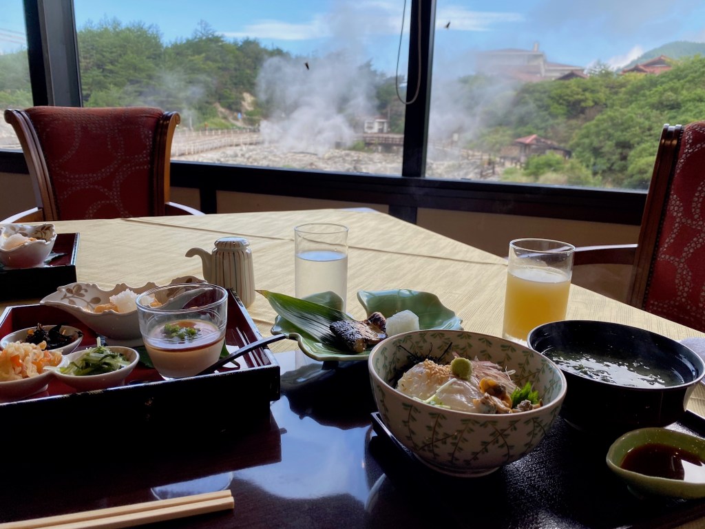 昨日に九州入りして、最初の朝、梅雨もさって天気がすごぶる良い。真っ青な空は久しぶりだ。気温も程よくて観光にはもってこいだ。朝から雲仙地獄を見ながら豪華で美味しい朝食、その前にすでに露店風呂に入って心身ともにスッキリ。健康的だ。