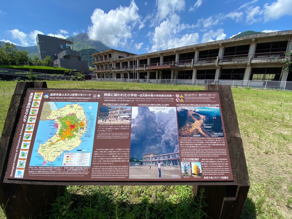雲仙の噴火のことがわかるジオセンターに寄ってみた、誰も居なくて、説明員の人に話を聞く。東京から来たと言っても怯まないのが良い。マスクもしてなく、地方だと都心の人を嫌がるとかマスコミ騒いでるけど、今の所みんな好意的だし、親切だ。何故こんな危険な所に人が住むかと聞いたら、火山地帯は美味しい水があるからだと答えてくれたが、私的には、温泉があったり、海があって、資源が豊富で、何と言ってもなだらかな広い土地があるという事が最大の理由だと思う。街を作るには最適だ。ジオセンター脇の小学校、火砕流の証拠として保存されてたけど、驚いたのは鉄は熱で曲がって錆びてたけど、アルミはほぼ変化が無かったのが意外。熱的にはアルミの方が融点が低いけど火砕流に対してはビクともしない。アルミの比熱と伝導率が原因と思われる。