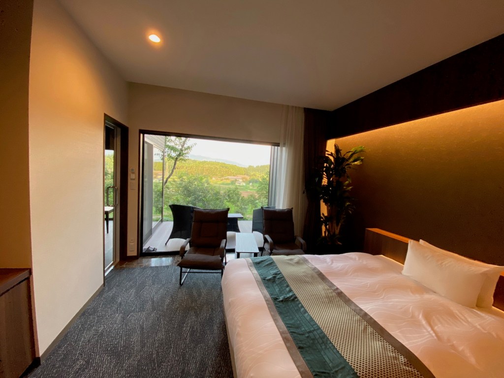 下道を1時間タラタラ走って、明るいうちに無事宿に到着、小高い丘の上に立つ天空の城見たいな所で、360度景色が良くて、日本じゃ無いみたいな所。それでいて比較的市街地からも近くて不思議な所にある。部屋は広くて、サンルームや半露店風呂も装備で純粋な温泉だ。こんなゆったりとした景色を見ながらお風呂に入ってリモートワークだったら毎日でも良い。ほんと素晴らしい、ここに住みたい。