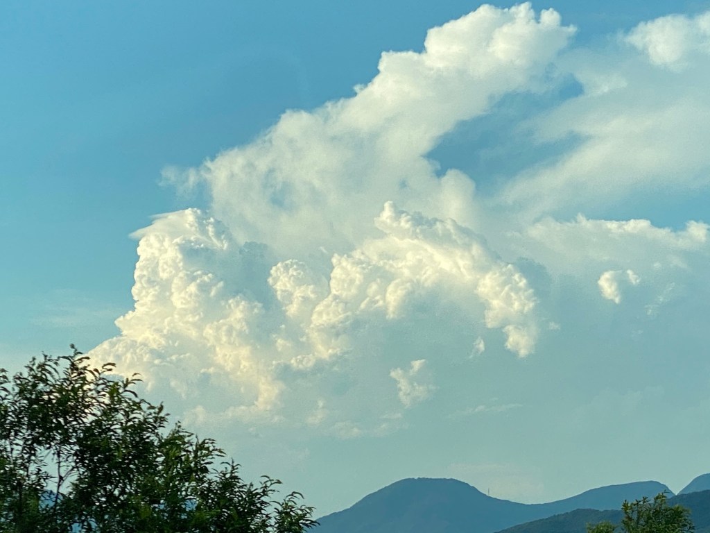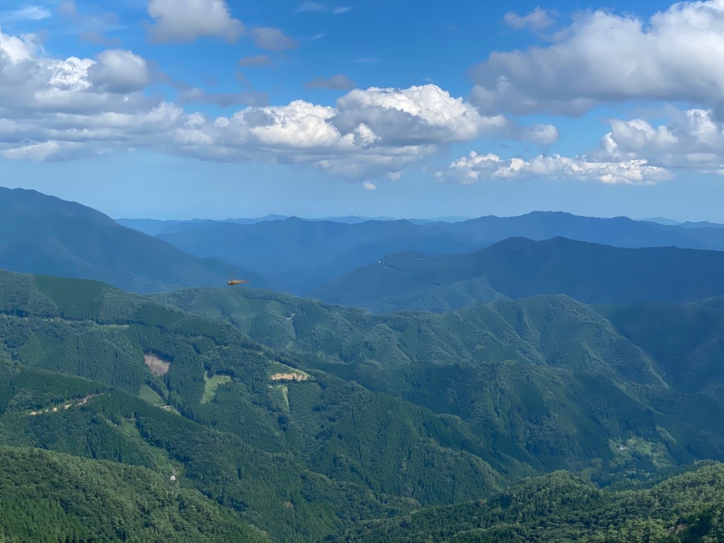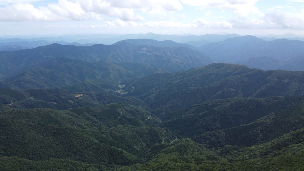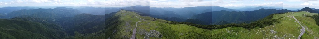 遠く積乱雲が見える、瀬戸内海方面だな。途中米塚みたいな小高い山群発見、これはフランスのクレルモンフェランに似てるかもしれない。あまり知られていなさそうだが、ここは日本のクレルモンフェランだ。今度調べよう。