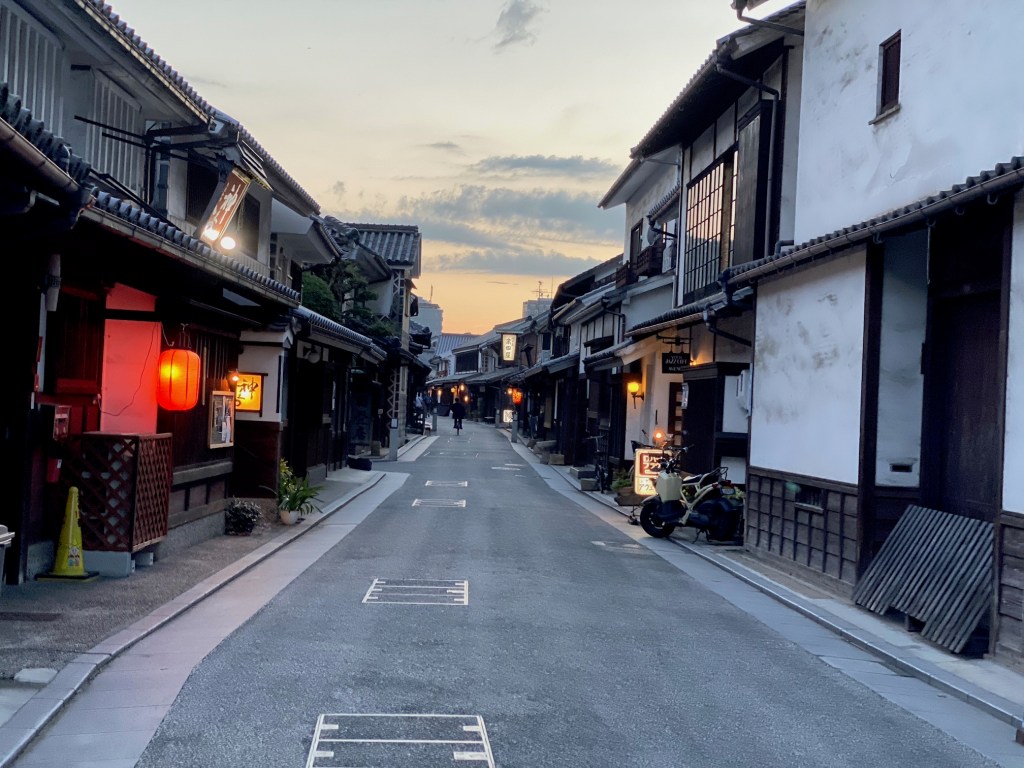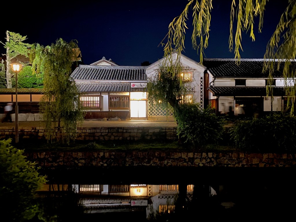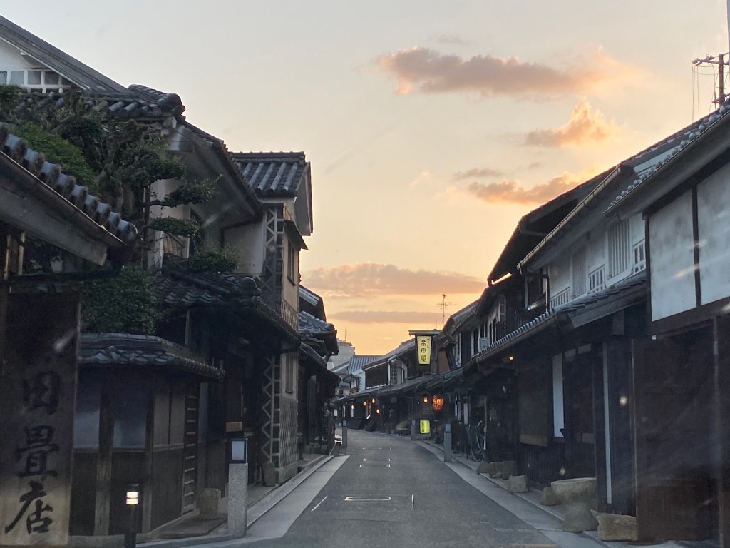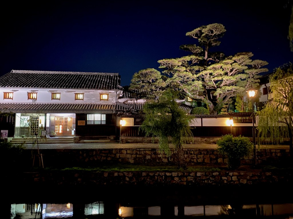 やった夕焼けの綺麗な倉敷到着。ミッション達成、若女将が迎えてくれて、車を近くのパーキングに停め宿に入る。280年の歴史ある旅館で、坂本龍馬も泊まったらしい。倉敷では由緒ある旅館だ。なんと言っても歴史的町並みにあるのが良いし、まさに旅館自体も観光施設だ。