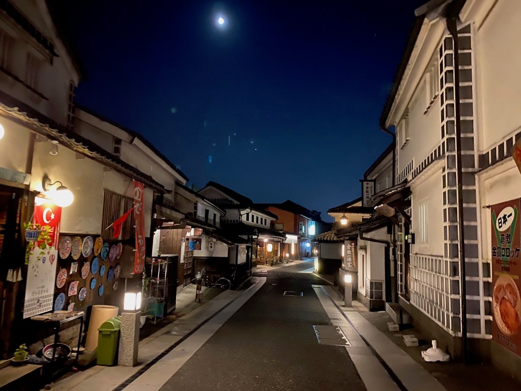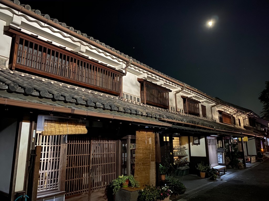 月明かりに照らされた古い街並みが美しい。300年前紡績等で、財を成した人達が此処で暮らしたと思うと感慨深い。電柱が無いから、街並みが映えるな、日本の価値を落としてるのは電柱だ、コロナ対策の予算で、日本中の全ての電柱をなくして欲しい。