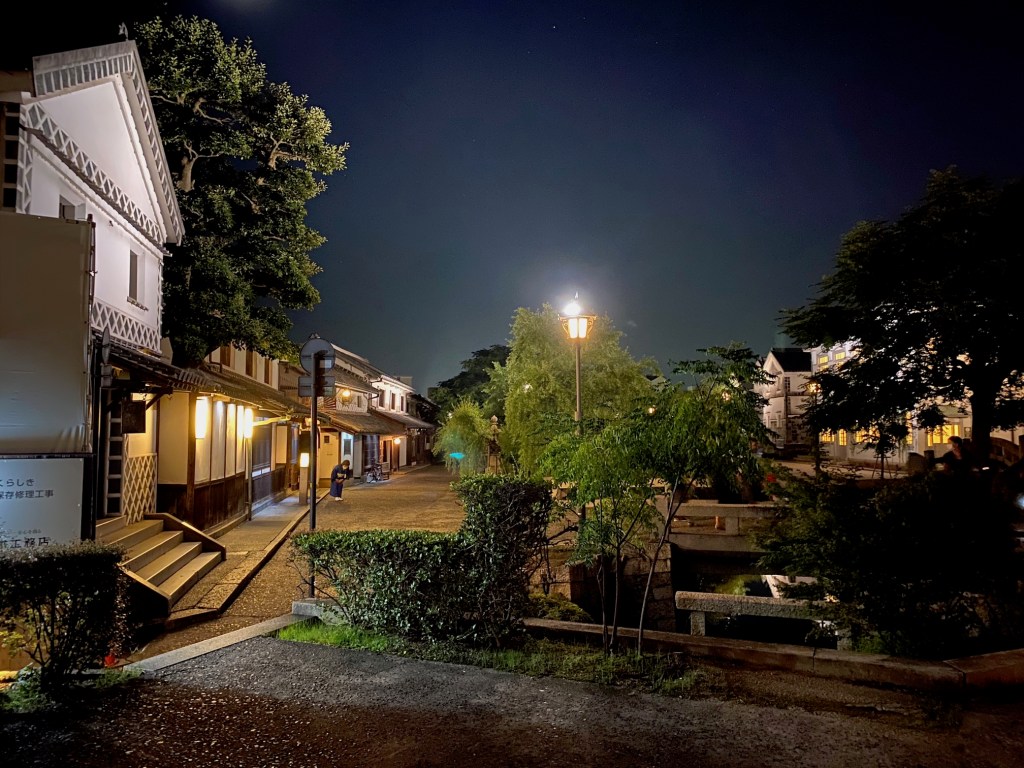 ほろ酔い気分で、街を散策してみると、素晴らしい景色、人が少ないじゃなくて、誰もいない倉敷なんてあり得ない。これが夏休みシーズンなんだから、もしや異次元空間い舞い込んだ様だ。人を強制排除しない限りはこんな写真は撮れない。そして此処に泊まらなければ見れない景色だ。