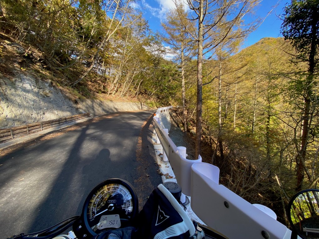 高度を上げていくと黄色主体の紅葉が黄金色に輝いて、幻想的で素晴らしかった。 新緑も素晴らしいが紅葉も素晴らしい。自然のメカニズムは全くもって、奥が深い。 紅葉を堪能して、エンジンカットでサイレントに韮崎まで降りる。途中富士山が見えるところで一休み、ツーリングの締めには良いところだ、できればこんなところにカフェがあったら最高だが、缶コーヒーで我慢だな。韮崎で高速に乗って、気持ちよく走っていたが、上野原から激混みになって旅の疲れがどっと出る。帰宅して洗車してお風呂入ってやっとツーも終わり。やっぱりバイクは最高だった。