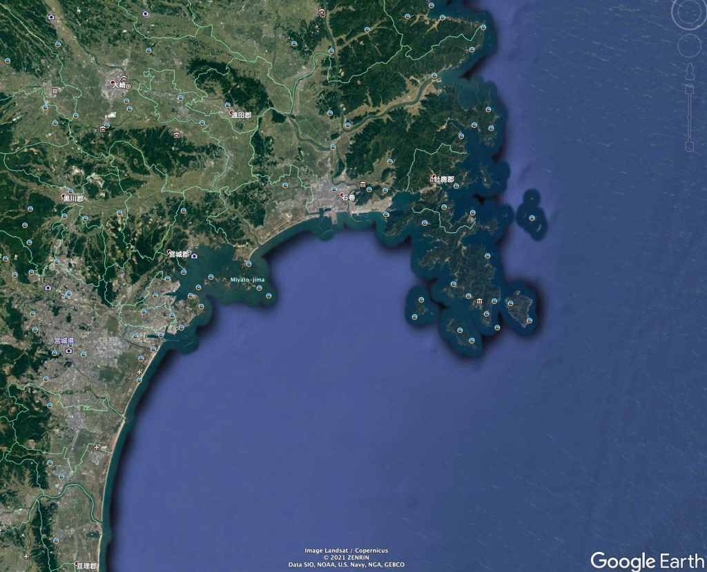 福浦島を観光するために橋の袂にある料金所についてみると、津波の高さが示してあった。写真撮り忘れたがなんと背丈くらい、目の前海なんですけど。ちょうどその高さは海面から3mくらいだった。台風の高潮レベルなんじゃ無いのかななんて思って、Googleマップを見るとなるほどそういう事か。当時津波は東から進んできており、仙台東北を直撃した。その大被害の仙台のわずか上に当たる松島は全く被害が無いのだけれど、理由は簡単、進んできた津波は男鹿半島にぶつかり、減衰、さらに宮戸島に阻まれて迂回して松島湾に到達、この時松島湾は見ての通り入り口が狭く湾内が広いために流入する海水の量は堰き止められてかつ湾内の水深が深いために分散し、海面の高さは津波の実高さ同様になったという簡単な物理現象の結果ということがわかる。データで見ると松島は2.9mでありこの地区最低だ。ご存知のように津波は海面の高さが変わる現象だがそれは体積の変動であって、深い海では何も変化がない。日本海溝付近では50センチも変わらないだろう。この簡単な物理学がわからずして日本は一応の津波対策してたんだから呆れる。外洋に面したところに原発立てたらそれはイチコロだ。 地形的に波が集まるような絞られた場所は逆に高くなり、シュミレーションで簡単に解りそうだ。よって塩釜と隣の石巻は明暗を分けたけど、この現象を理解した上で今回堤防が造られているかは謎である。